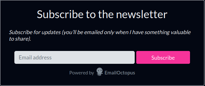 In the code above, I did this: in the first CSS rule, I selected the relevant class from the Email Octopus sign-up form and assigned it a darker background color. Then, below that, I changed the text color to be lighter. And in the third CSS rule, similar to the second, I changed the color of the text. If you are interested in what oklch() that I used in CSS above is, then go to MDN documentation. About CSS specificity, you can read here. The result is down below: