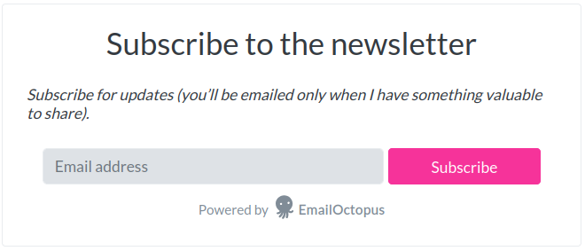 And if the light theme is on, then there won't be any dark class on the html element, and therefore, styles from the Email Octopus form won't be overridden. Here is how it would look on the light theme: